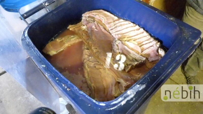 Az ellenőrök az udvaron kopasztó gépet, üstöt, húshorgos állványt, valamint téglaépítésű füstölő is találtak. Az ingatlan más részein többek között rozsdás, szennyezett kolbásztöltő gép és nagyméretű húsdaráló volt. A füstölőben az ellenőrzés során épp kolbász készült. A szakemberek egy 120 l es műanyag hulladéktárolóban rothadó, bűzös sertéshúst is találtak, az ellenőrzött elmondása szerint a pácolás alatt lévő termék megromolhatott.