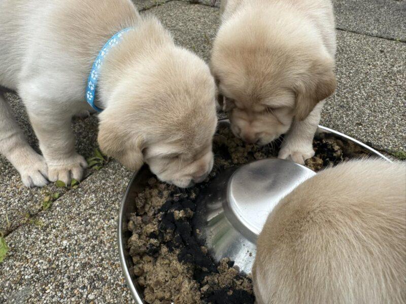 A kicsik 4 hetesek lettek és ez vízválasztó időszak az életükben. Az anyatej mellett már pépes, áztatott tápot is esznek, illetve megismerkedtek az udvarral – számolt be a kicsikről a Baráthegyi Vakvezető és Segítő Kutya Iskola Alapítvány.
