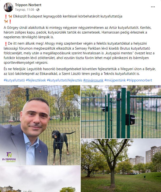 „Elkészült Budapest legnagyobb kerítéssel körbehatárolt kutyafuttatója” – büszkélkedik az újpesti polgármester a legnagyobb közösségi oldalon. Bár a méretre vonatkozó állítása tényszerűen nem igaz, ugyanis a Városligeti Kutyás Élménypark több, mint 5000 nm-en terül el, de ez nem von el sokat a hírértékből.