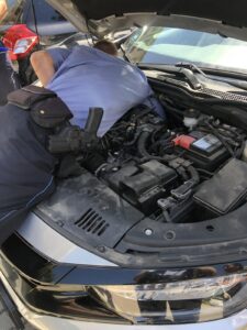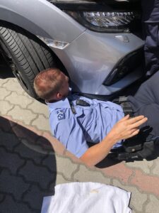 Miután bemérte a cica szorult helyzetét, alulról, majd felülről is próbálta megközelíteni a jármű motorterének aljába, a motorvédő burkolathoz rekedt csöppséget. A földön fekve, vagy a motortérre hasalva igyekezett közelebb férkőzni hozzá, végül nem kis tornagyakorlatok árán, de szerencsére sikerült az egyre hangosabban jajgató állatot épségben kiszabadítani.