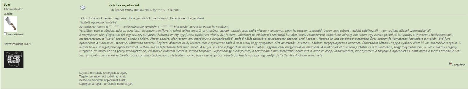 A szerző szerint a „vallomást” valaki kimásolta a fórumról és Horváth Zoltán felhasználónévvel tette közzé a Facebookon a Vadászat EVO – Hagyományok és haladás, beszélgetések a tűbortűznél című csoportban, amire a hírportálok (többek között mi is) hivatkoztak.