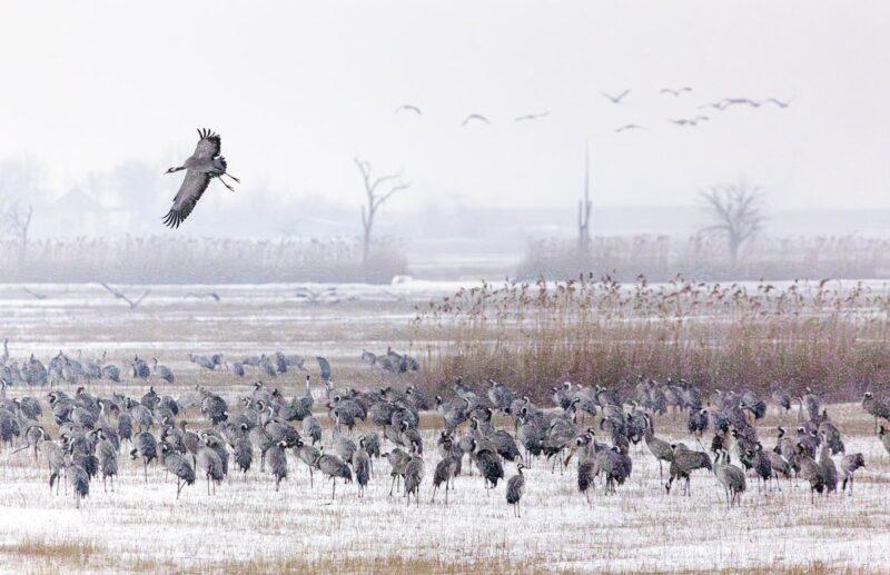 A kemény hideg és a vastag hóborítás ellenére is még több száz daru tartózkodik a Körös-Maros Nemzeti Parkban a kardoskúti Fehér-tó térségében – írja a Körös-Maros Nemzeti Park.