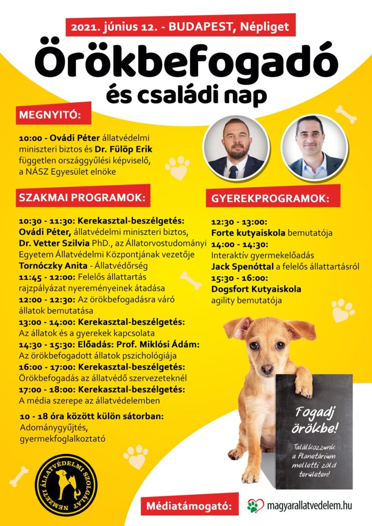 Az elmúlt egy év mindenkit nagyon megviselt, az örökbefogadó és családi nap pedig jó lehetőség arra, hogy egyrészről színvonalas programokkal várjuk az állatbarátokat, másrészről hogy egy asztalhoz ütessük a hazai állatvédelem szereplőit. Nagy öröm számomra, hogy Ovádi Péter miniszteri biztos, Dr. Vetter Szilvia az Állatorvostudományi Egyetem Állatvédelmi Központjának vezetője, Tornóczky Anita az Állatvédőrség szóvivője mellett olyan elismert tudós is elfogadta a meghívásunkat, mint Miklósi Ádám professzor, akitől egy nagyon érdekes előadást hallgathatunk majd meg az örökbefogadott állatok pszichológiájáról.