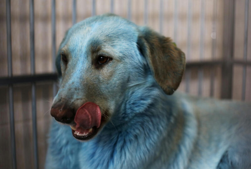 Vegyszerektől elkékült kutyákkal nemcsak Oroszországban találkozni: három évvel ezelőtt Indiában, Mumbaiban fotóztak az oroszoknál világosabb árnyalatú, de határozottan kék kutyákat. Ott az derült ki, hogy egy gyár olyan erős klórvegyületet eresztett illegálisan egy folyóba, hogy az megfestette az arrafelé úszkáló kutyák bundáját.