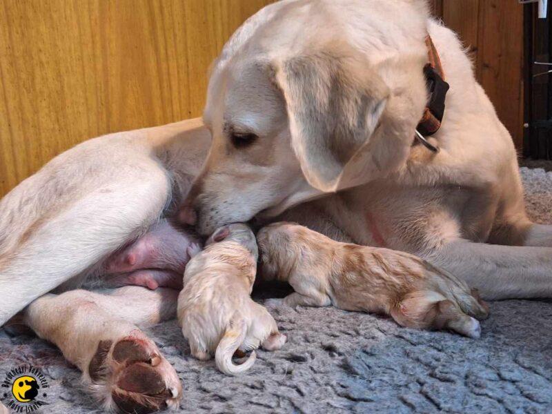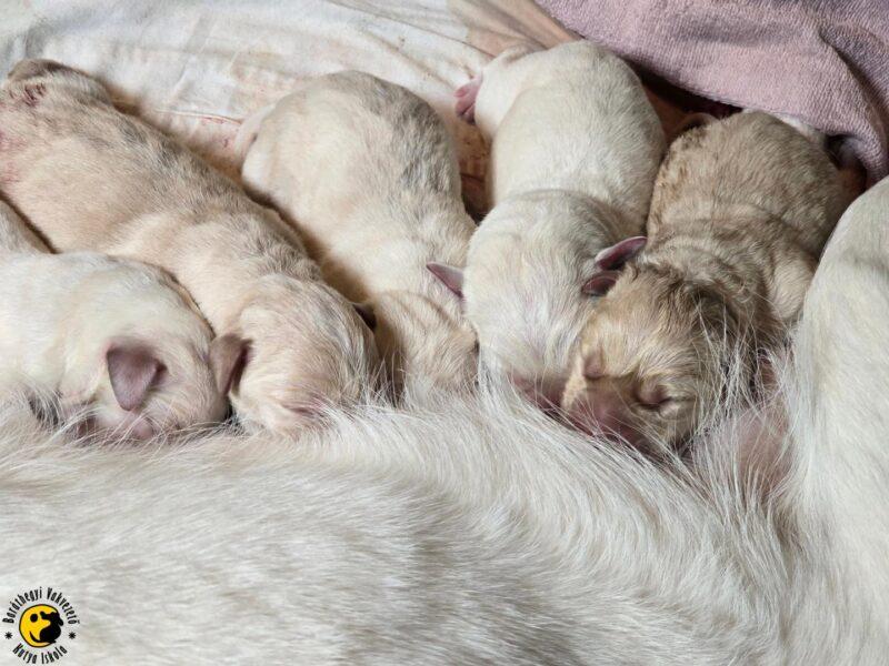„Lassan, szinte óránként jöttek a kis gombócok. Borsó együtt alszik velük, és tisztogatni is kezdte őket. Kezd belejönni, de még segítünk neki” – árulta el a gazdi. A kölykök súlya 480 és 495 gramm között változott, és az alom születése a Baráthegyi Vakvezető és Segítő Kutya Iskola szakmai vezetője, Komondi Piroska jelenlétében zajlott.
