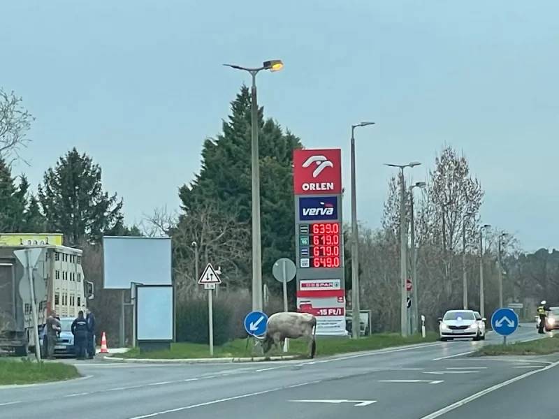 A 71-es főúton, a Balatonakarattyához tartozó Orlen benzinkút közelében rendőri irányjelzéssel halad a forgalom, miután egy bika – feltehetően – vad kóborlásba kezdett.