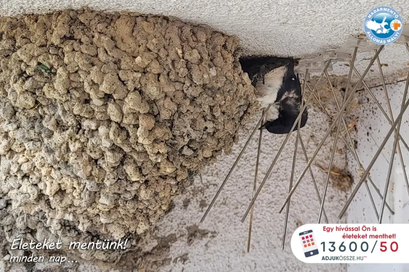 Felnyársalta a fiókáit etetni siető fecskemamát a miskolci irodaházon szabálytalanul felszerelt galambtüske! Ezeket a tüskéket tilos fecskék ellen felszerelni, fejjel lefelé berepülési szögben, de itt mégis megtették.