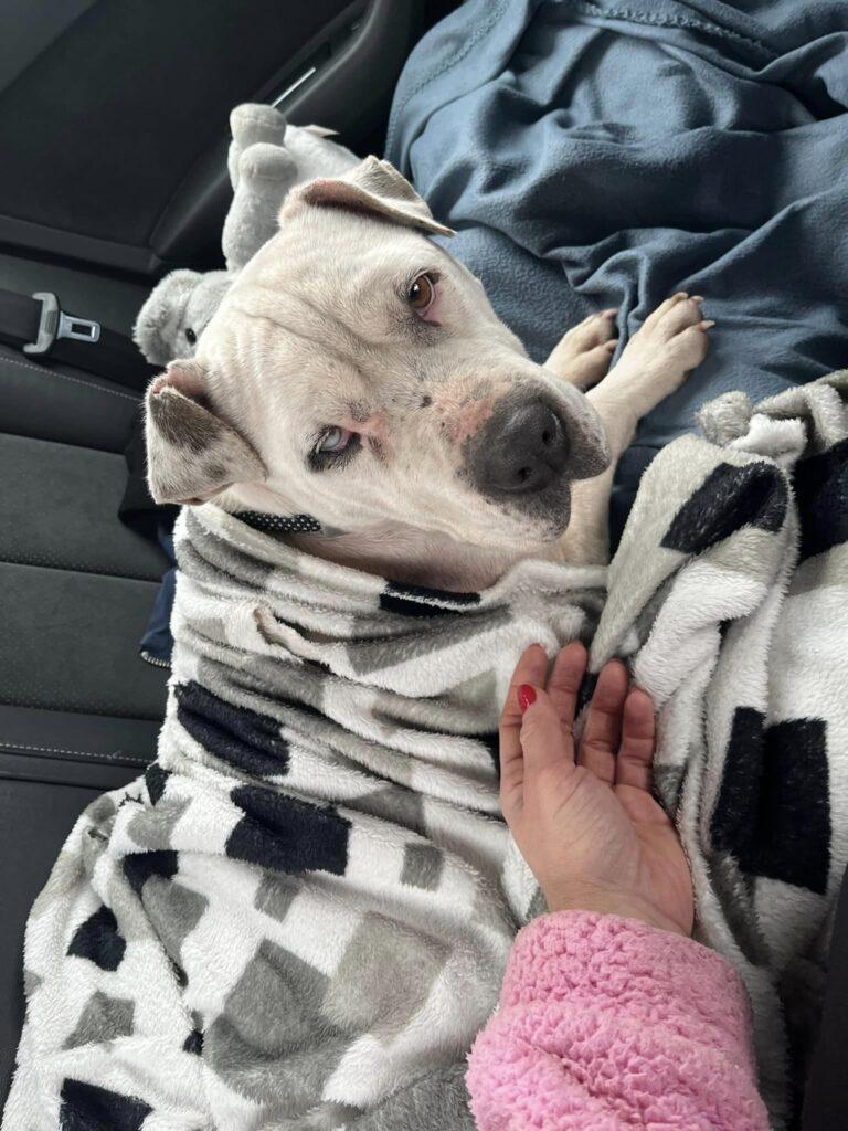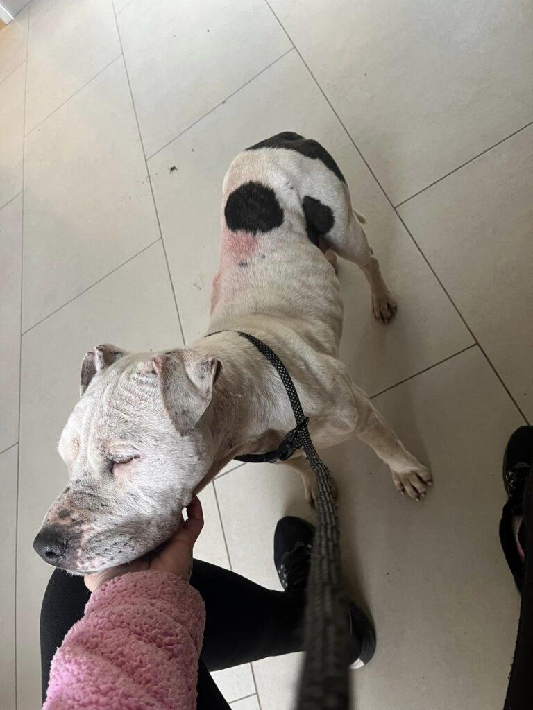 Pár napja keringett egy segítségkérő poszt egy udvarra betévedő bull típusú kutyusról. A poszt alapján bántalmazott, vemhes és tele van kullancsal. Mivel nem volt megoldás, tegnap kocsiba pattantunk és elhoztuk.