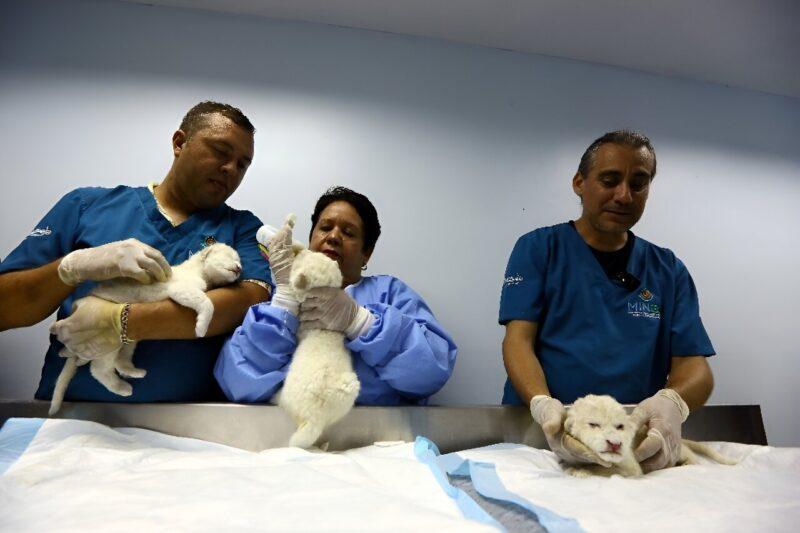 „Ők az első fehér oroszlánok, amelyek Venezuelában születtek. Három kölykünk van, két hím és egy nőstény” – mondta Anthony De Benedictis, a venezuelai Maracayban található Las Delicias állatkert igazgatója.