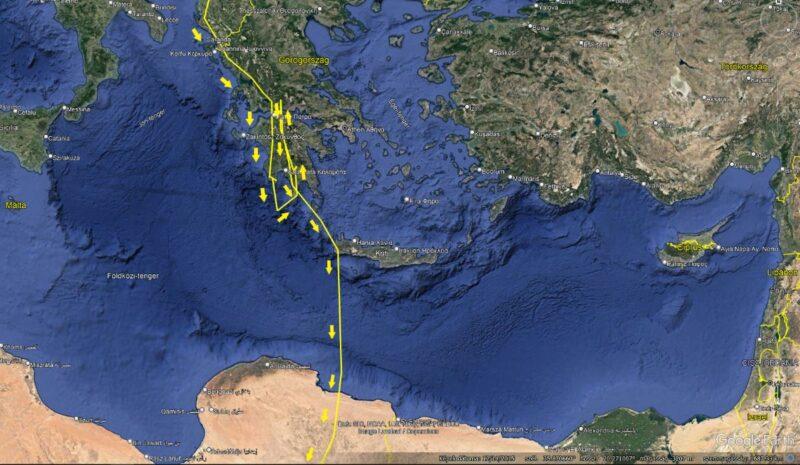 Szeptember 26-án aztán átkelt Korfu-szigetére, másnap pedig visszament a görög szárazföldre, ahol egy napot töltött, feltehetően táplálkozással. Útját tovább folytatta délnek a partok mentén, a tenger és a szárazföld felett. 28-án este már Zakintosz szigetének déli csücskén aludt. Másnap hatalmas fába vágta a fejszéjét, ugyanis nekivágott a Földközi-tengernek, és 550 km-t egyhuzamban repülve, szinte nyílegyenesen délnek tartva át is kelt azon – ismertették a nehéz utazás részleteit.