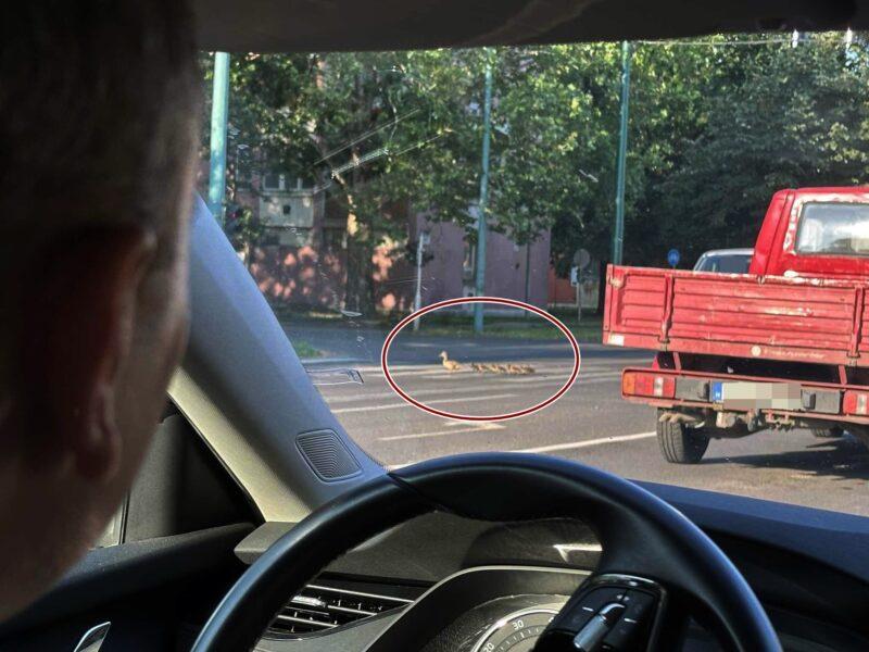 Nem csak ők, minden járművezető lassított, megállt, hogy a szárnyasok biztonsággal elérjenek a másik oldalra. A kolléganőnk sietve előkapta a telefonját és próbálta megörökíteni a pillanatot, míg a hátsó ülésen a kislányuk nevetve nézte a madarakat, amint példát mutatnak, szépen egy sorban mennek át a zebrán.”