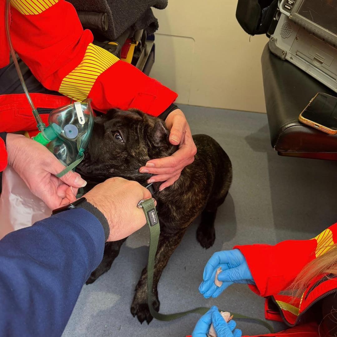 Hozzáteszik, a mentődolgozók azonnal oxigént adtak a kutyusnak, ami rövid idő alatt sokat javított a rémült blöki állapotán. Hamarosan barátkozni kezdett az életmentőkkel, akik megnyugtatásképpen saját felvágottjukból is megkínálták a kisbeteget. Nem sokkal később a gazdi is a helyszínre érkezett és átvette kedvencét a mentőktől.