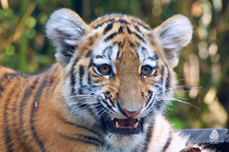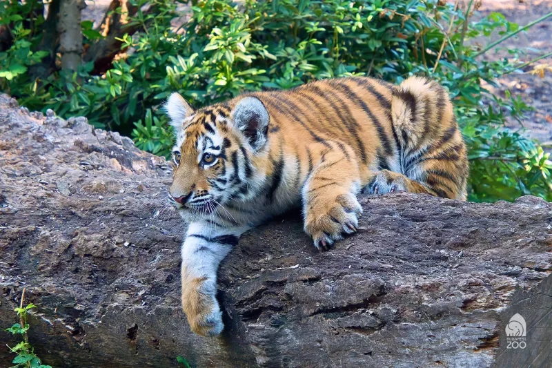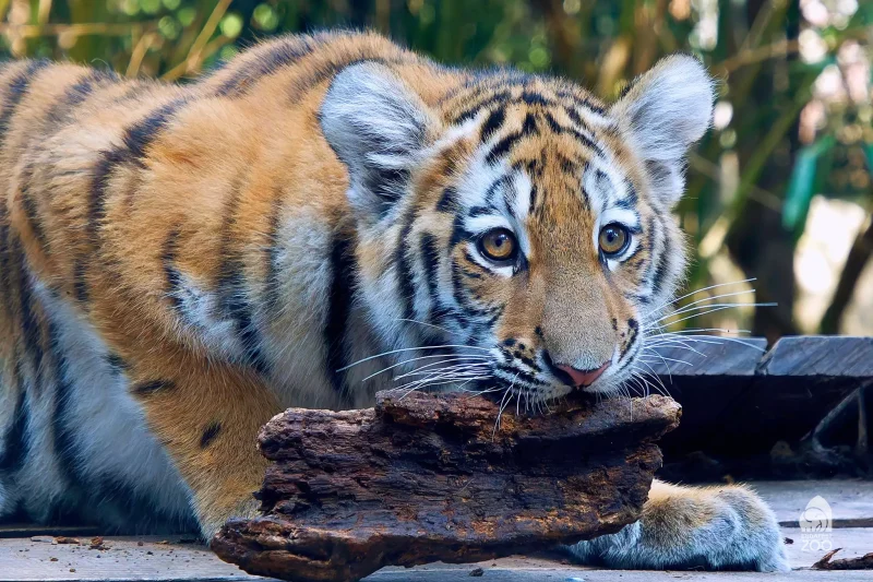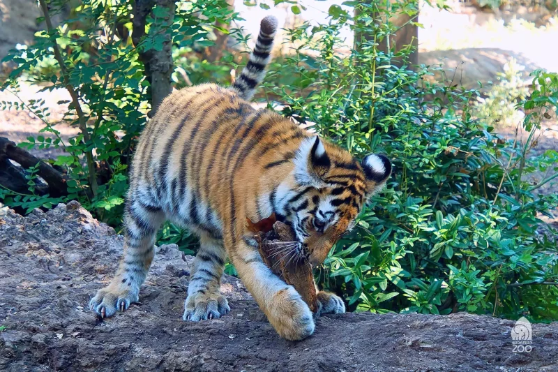 A kölyök nemcsak az ételt rágcsálja szívesen, hanem a kifutó berendezését is: a fatörzsek mászásra, kaparásra és harapdálásra egyaránt kiválóak számára. Egy kisebb, könnyen mozdítható fadarabot gyakran zsákmánynak tekint, elhurcolja, harapdálja, és még akkor is őrzi, ha épp nem játszik vele. Ezek a játékos szokások segítik abban, hogy kifejlessze azokat a képességeket, amelyekre majd felnőttként is szüksége lesz.