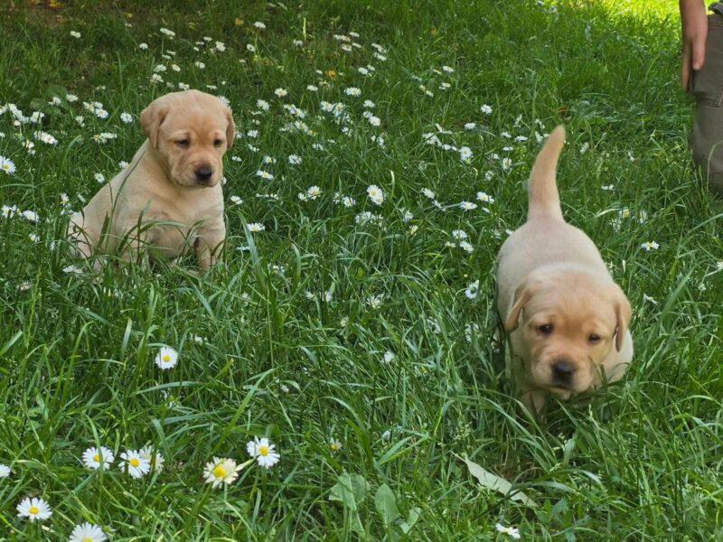 Vidáman szaladgálnak a virágok között Malina 4 hetes kölykei. Napról napra sokat nőnek és erősödnek a lányok – számolt be a kicsikről örömmel közösségi oldalán a Baráthegyi Vakvezető és Segítő Kutya Iskola Alapítvány.