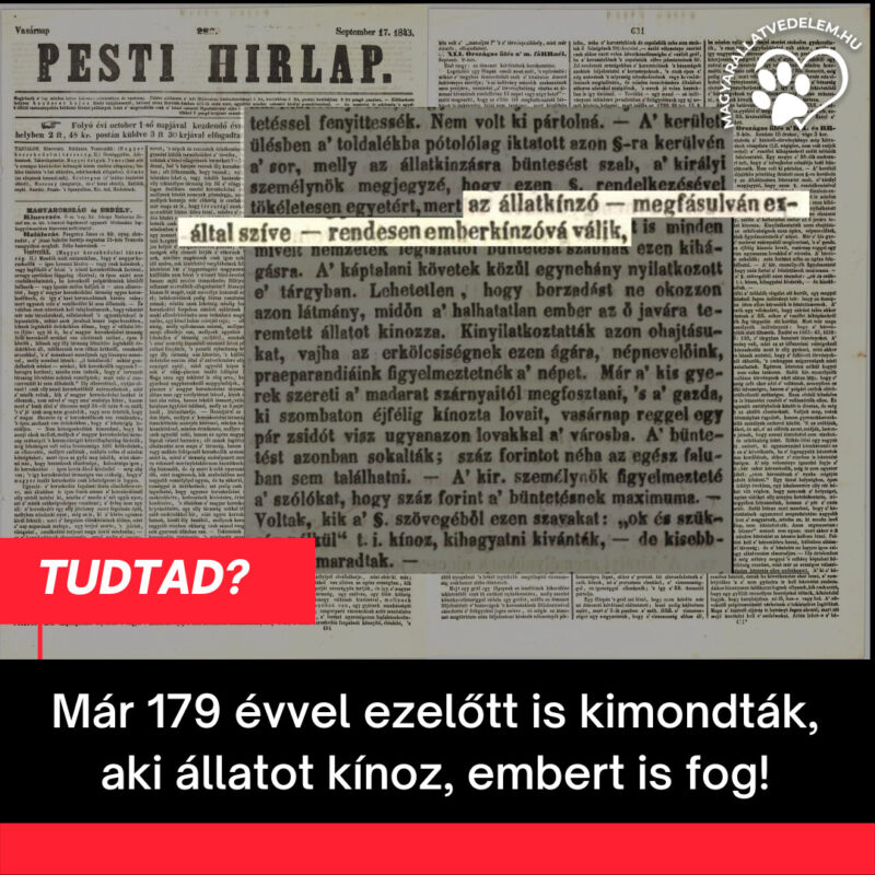1843. szeptember 9-én került az Országgyűlés elé Magyarország történelmében legelső alkalommal az állatkínzás büntetésének kérdése. Erről a Pesti Hírlap szeptember 17-i száma így ír: