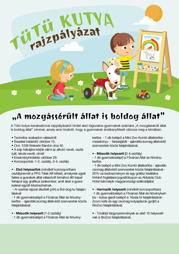 „A mozgássérült állatok sajnos sokszor a mostohagyermekek, nem kapnak elég figyelmet. A rajzpályázat által reménykedem, hogy ez meg fog változni” – tette hozzá a TÜTÜ kutya-kerekeskocsi megálmodója.
