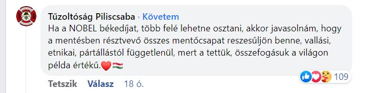 Nobel-békedíjat javasolt a piliscsabai tűzoltóság a mentésben részt vevő hősöknek.
