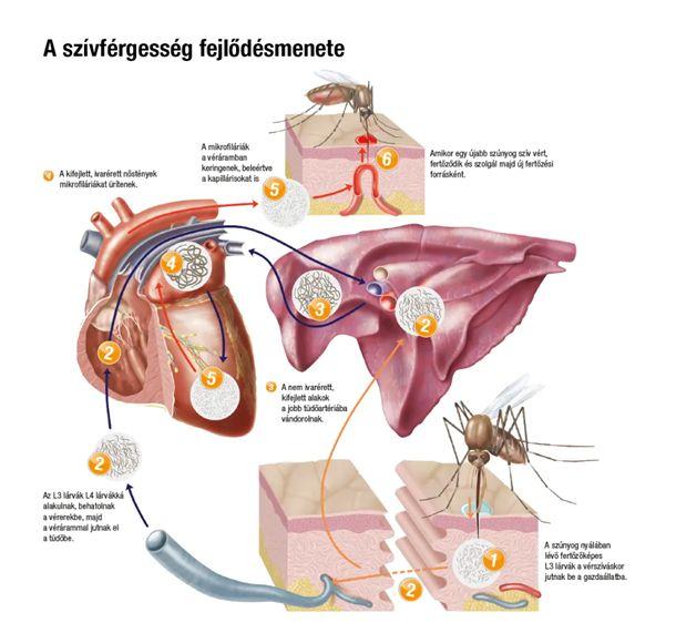 A szúnyogokban ezekből a pici élőlényekből, kedvező hőmérsékleti viszonyok között, vedlések révén kialakulnak az úgynevezett fertőző lárvák, amelyeket vérszíváskor egy másik kutya vérébe tudnak átvinni. A nevével ellentétben azonban nem a szívben, hanem elsősorban a tüdő nagy ereiben élnek, a szívbe már a nagyon előrehaladott állapotban juthatnak el.