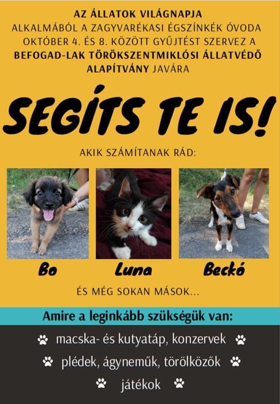 A zagyvarékasi Égszínkék óvoda ezzel az akcióval, melyet az állatok világnapjához kapcsolódva hirdetett meg, a Befogad-lak Törökszentmiklósi Állatvédő Alapítványt támogatta – szúrta ki a szoljon.hu. Az önkéntes szervezet mint menhely működik, és kizárólag az adományoknak köszönhetően tartja fenn magát. A kutyák és macskák mellett azonban segítettek már gólyáknak, baglyoknak, fecskéknek is.