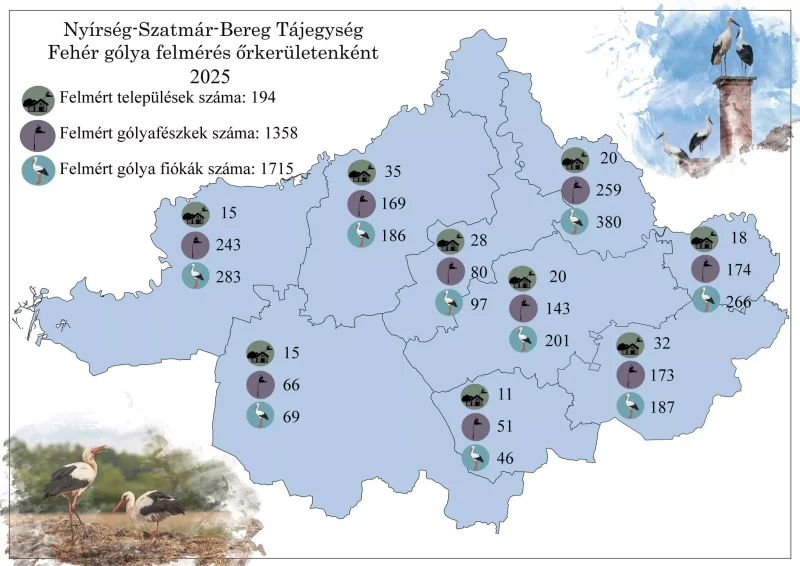 A Hortobágyi Nemzeti Park Igazgatóság szakemberei 2025-ben is elvégezték a fehér gólya (Ciconia ciconia) állomány éves felmérését a Nyírség–Szatmár–Bereg Tájegység területén. A Természetvédelmi Őrszolgálat munkatársai nemcsak az aktív fészkeket, hanem a lakatlan, fióka nélküli és az üres fészektartókat is ellenőrizték, hogy pontos képet kapjanak a faj helyi helyzetéről.
